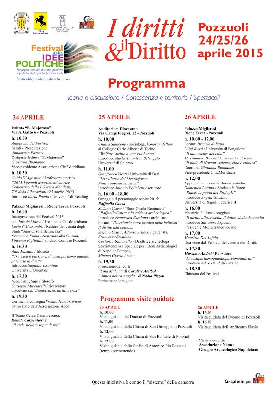 Esiste un luogo in cui diritto alla bellezza e Storia si incrociano? Un luogo in cui la filosofia è libertà di pensiero; in cui il Mezzogiorno ha una sua dignità e rivendica il proprio diritto allo sviluppo; in cui la terra non è un limite invalicabile e il confine è solo una questione di punti di vista? Esiste un luogo in cui le migrazioni sono trasformazioni del paesaggio umano e non invasioni barbariche d’altri tempi; in cui decrescere è un dovere, perché di produrre disuguaglianze non ne possiamo più – e l’uomo, l’ambiente, l’anima non possono reggere a lungo? Un luogo in cui gli sprechi non sono più tollerati e si torna a voler gioire dell’essenziale? Esiste un tale luogo? Non possiamo ancora dare una risposta certa. È nostro dovere però invitare gli scettici, gli speranzosi e i curiosi, il 24, 25 e 26 aprile, a Pozzuoli: pare che qui si stiano attrezzando per crearlo, questo luogo, questa meravigliosa utopia. Incontriamo Guido D’Agostino, Aldo Masullo, Domenico Lucano, Chiara Saraceno, Nadia Pizzuti e Caroline Abtibol; Gianfranco Viesti e Stefano Causa, Luigi Russi e Massimiano Bucchi, Nicola Magliulo e Giuseppe Micciarelli, Maurizio Pallante, Maurizio Del Bufalo, Massimo Andrei e Renato Carpentieri e altri ancora: non incontriamo solo nomi, ma soprattutto idee – è su di queste che si regge un’utopia, no? Li incontriamo, tra lectiones e dibattiti, anche con la volontà di trarne il meglio che possiamo per il nostro territorio, perché è da qui che dovremmo cominciare a costruire la nostra Utopia. Se “la ricerca dell’utopia è una ricerca religiosa, un desiderio di assoluto” e se “l’utopia è la grande fragilità della storia, ma anche la sua grande forza. In un certo senso, è l’utopia a riscattare la storia”, come suggerisce Emil Cioran, possiamo ben sperare che questo percorso reale/ideale ci avvicini a un mondo migliore, e scoprire addirittura di esserne artefici, oltre che spettatori.
